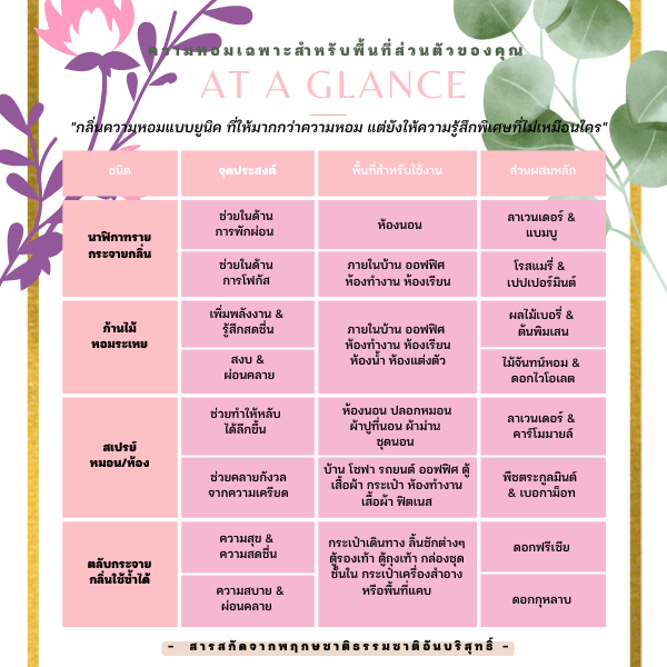 เป็นกลิ่นหอมที่มีเอกลักษณ์ช่วยส่งเสริมให้อารมณ์และความรู้สึกดีขึ้น จุดประสงค์คือการยกระดับคุณภาพจิตใจและร่างกายให้มีความสมดุล