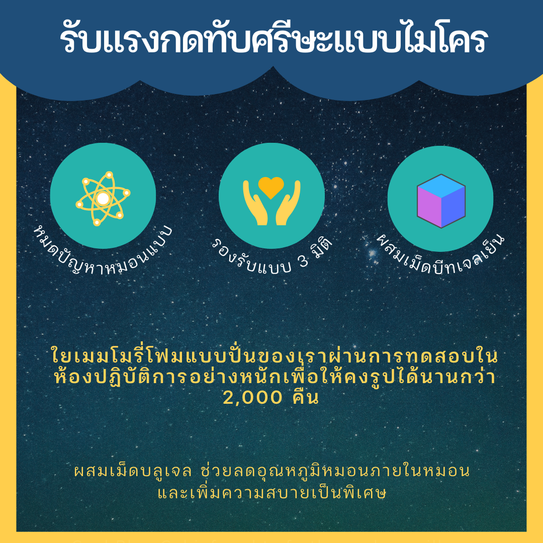 เมมโมรีโฟมได้รับการออกแบบมาตั้งแต่แรกเพื่อดูดซับแรงกดขณะบินขึ้นและลงจอดสำหรับนักบินอวกาศของ NASA ปัจจุบันเเราได้ใช้เทคโนโลยีเดียวกันนี้ และถูกนำมาใช้เพื่อลดแรงกดทับจากศีรษะและร่างกายของคุณเพื่อเพิ่มคุณภาพการนอนหลับที่ดีขึ้น