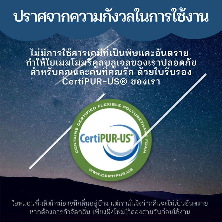 ใยคูลเจลเมมโมรี่โฟมใหม่มีแนวโน้มที่จะมีกลิ่น 'Off-Gassing' แต่กลิ่นจะไม่ทำร้ายคุณ เพราะเราใช้โฟมที่ผลิตขึ้นมาใหม่เท่านั้นและได้รับการรับรองการผลิตจาก CertiPUR-US® เพื่อความปลอดภัยของคุณ