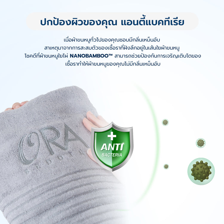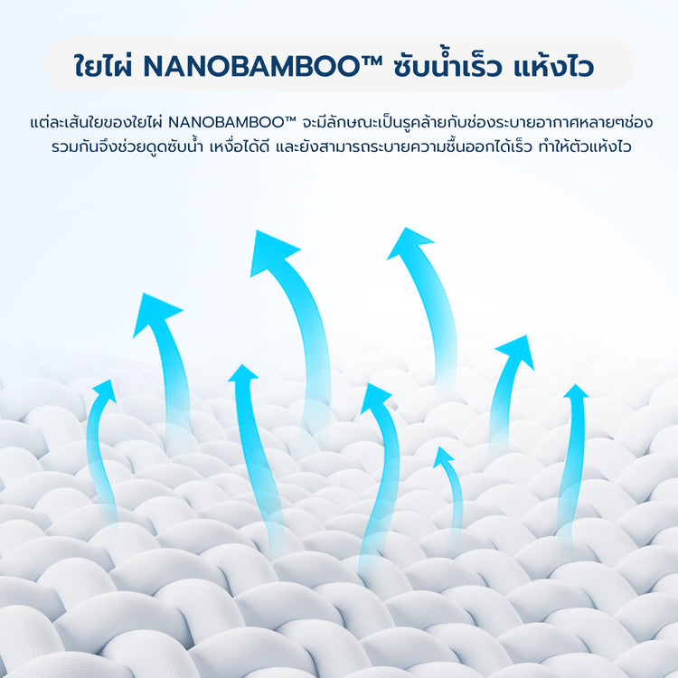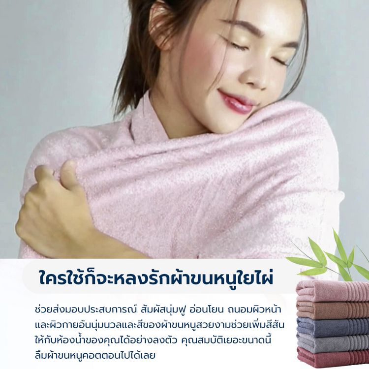 ผ้าขนหนูใยไผ่ธรรมชาติ 100% ผลิตจากเส้นใยไผ่เกรดพรีเมี่ยม Nano BAMBOO™ ถักทอด้วยนวัตกรรมอัน ออกมาเป็นผ้าขนหนูใยไผ่ของทุกบ้าน เส้นใยไผ่มีความนุ่ม อ่อนโยนต่อผิว ช่วยถนอนผิวคุณระหว่างการใช้งาน เหมาะสำหรับผิวแพ้ง่าย ผิวแห้งและทุกผิวสัมผัส ซับน้ำได้ดีตัวแห้งไว